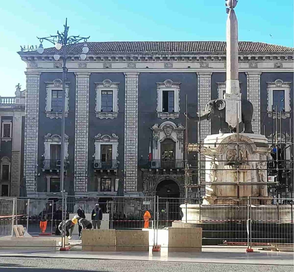 La Fontana dell’Elefante è attualmente in restauro all’interno di un cantiere “aperto” alla città, per circa due mesi, con attività che includono condivisioni tramite applicazioni digitali interattive.