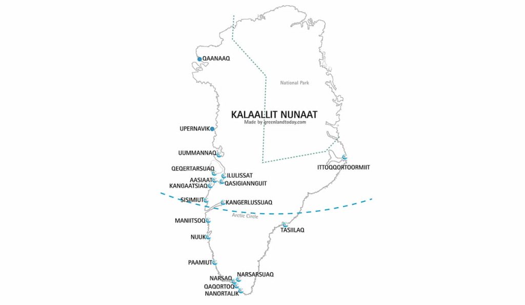 Dato che la grande calotta glaciale della Groenlandia copre oltre l’80% dell’isola, l’intera popolazione vive nelle regioni costiere prive di ghiaccio. Circa il 90% vive in sole 16 città (il 50% nelle 5 città più grandi) e il resto in piccoli insediamenti.